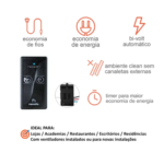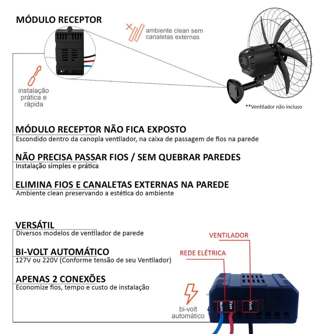 Dispensa o uso de caixas de embutir 4×2 ou interruptores usuais, ou seja, seu módulo receptor é instalado junto ao ventilador(canopla), caixa de passagens de fios no teto ou no forro, economizando fios para instalação e ainda sim não afeta a estética local;-