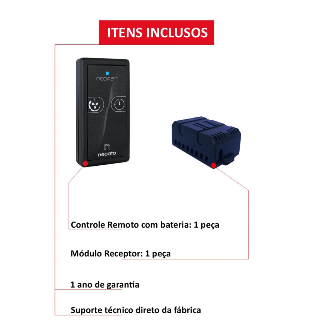 Itens Inclusos: Controle Remoto com bateria CR2032 3V + Base/Suporte do Controle Remoto + Módulo Receptor