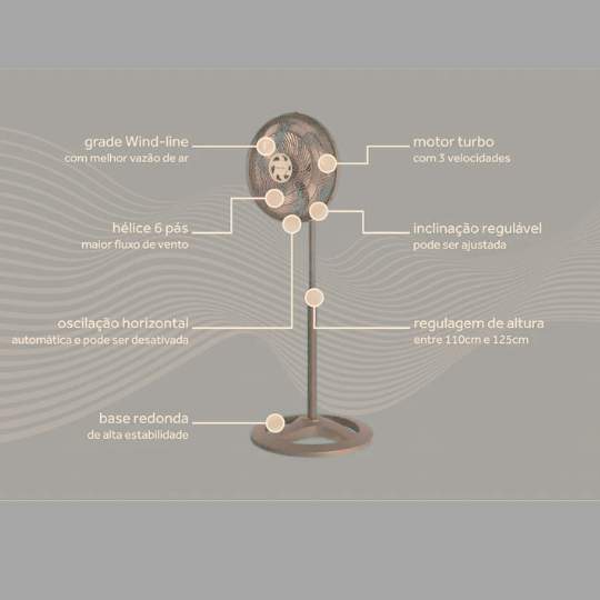 Design moderno e arrojado. Maior estabilidade para o ventilador.